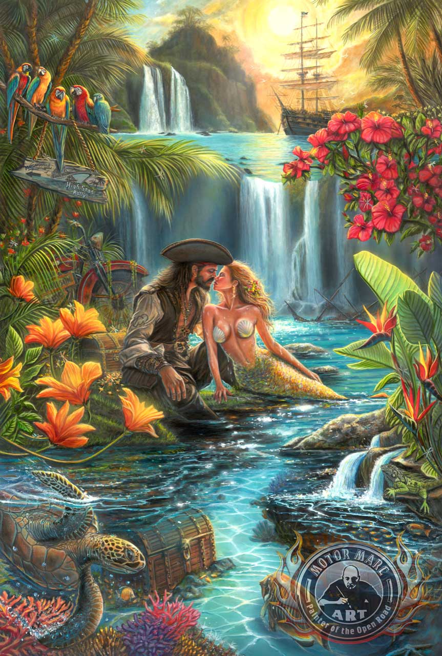 Motor Marc has created a beautiful tropic HSR fine art painting to give travelers the most adventurous journey looking for the many hidden treasures on the magical open seas.